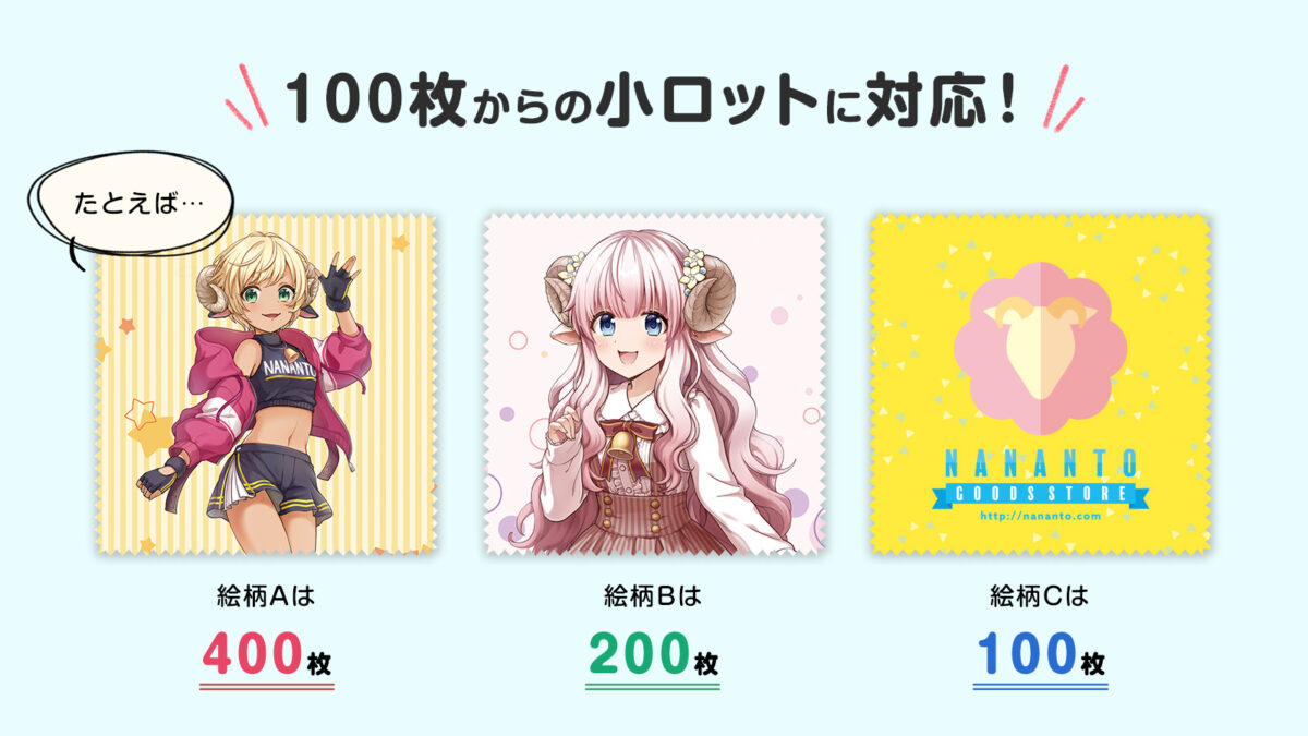 100枚からの小ロットに対応しているので、種類豊富な絵柄展開も可能です。絵柄、キャラクターによって数量が異なる発注などにも柔軟に対応します。