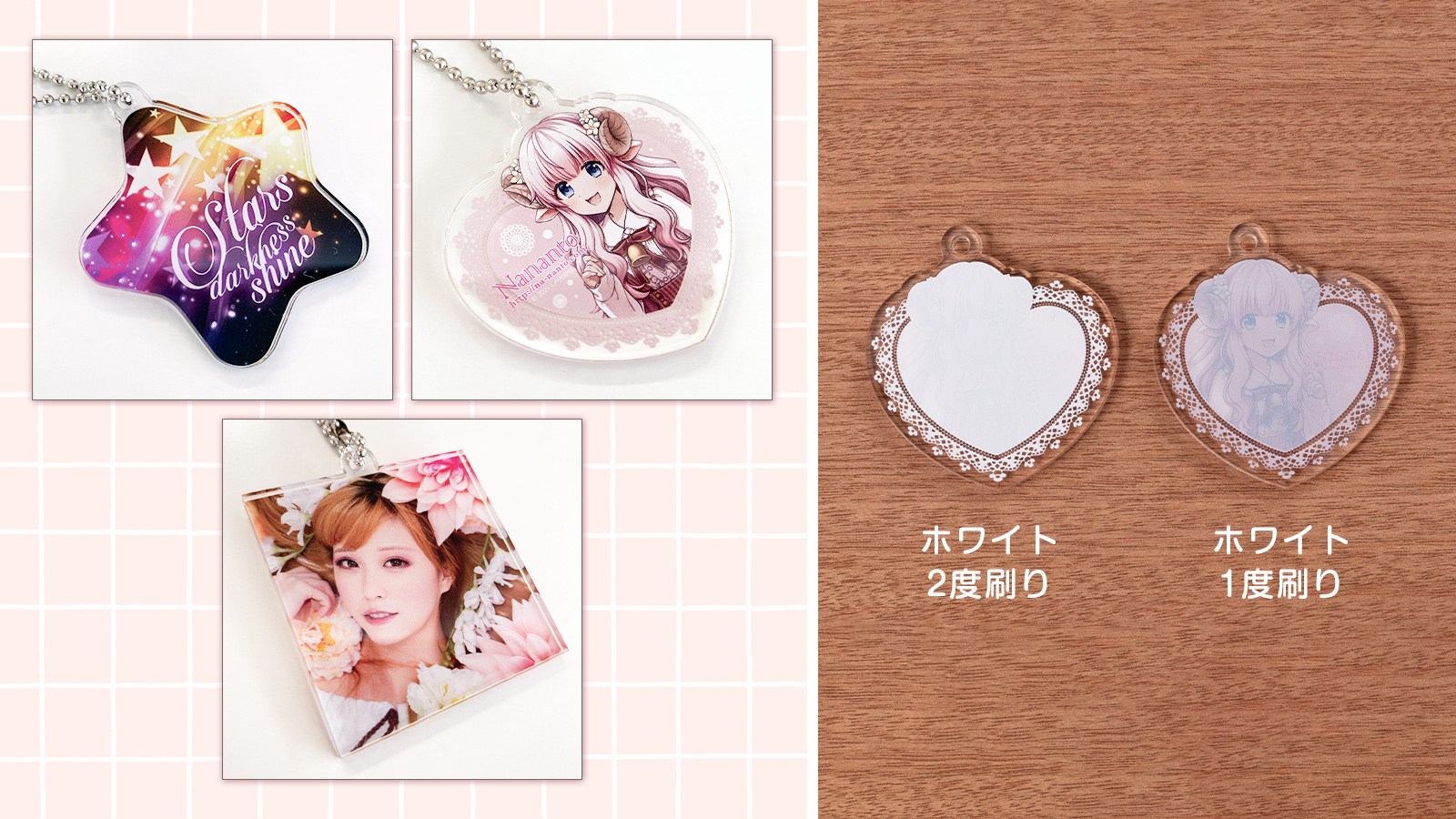 透明のアクリル素材を活かしてホワイトなしの透明感のある表現にするもよし、ベースにホワイトを引いて原画の色味をしっかりと再現するもよし、イメージに合わせて選択できます。