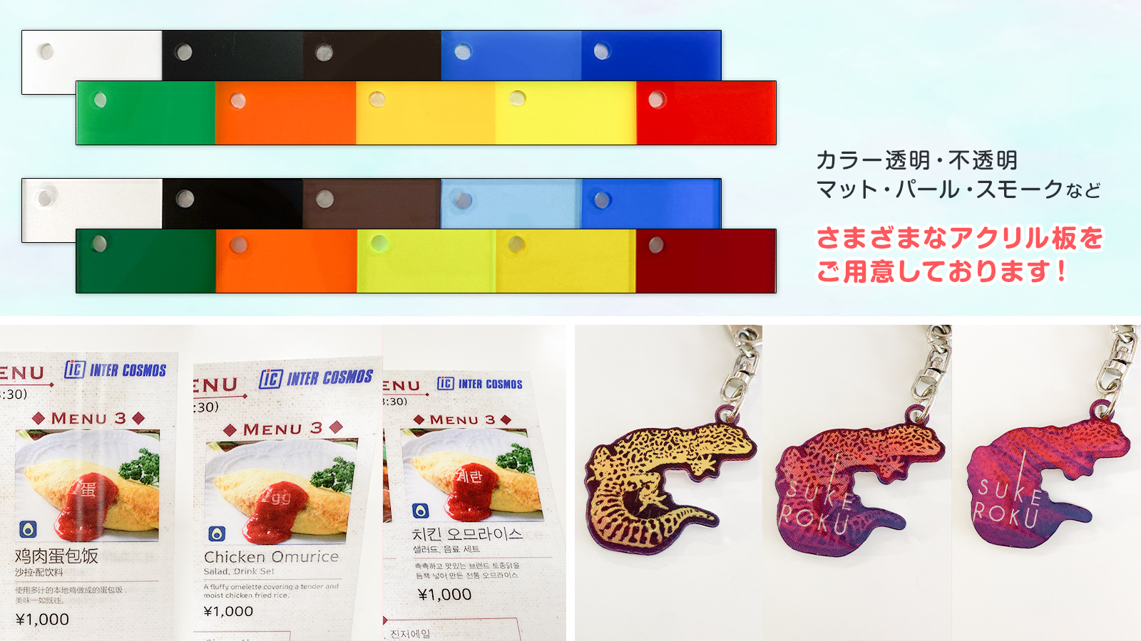 通常のアクリルフィギュアスタンドで使われる透明なアクリル板の他にも、色のついたアクリル素材を使ったり、レンチキュラーシートを使って絵柄をチェンジングさせたり、3Dで表現したり、といった特殊加工も得意です。いつもと違う商品を製作したい場合は、ぜひご相談ください。
