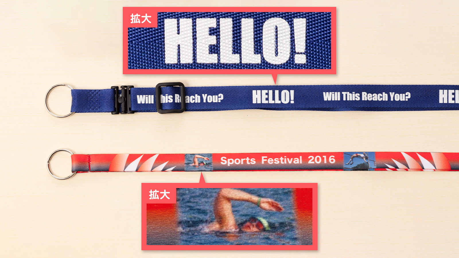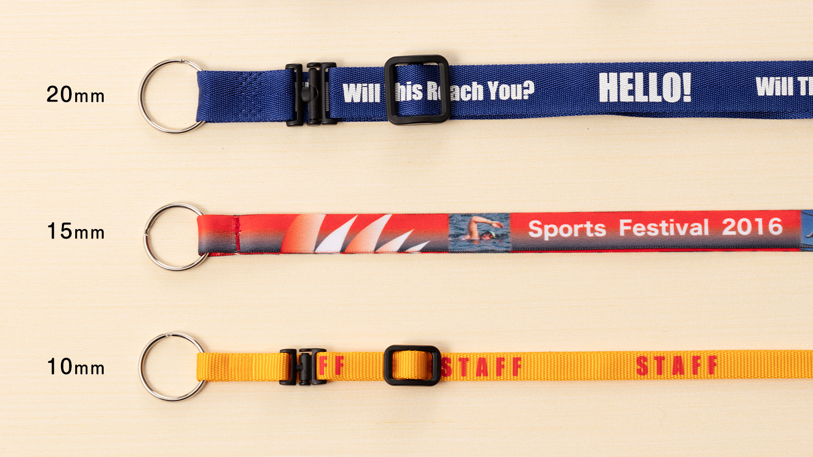 紐幅は、10、15、20㎜がベーシックで、社員証など多く使われているのは10㎜幅です。細かいイラストや絵柄などをプリントする昇華転写印刷は20㎜幅の太めのサイズが多く使用されています。