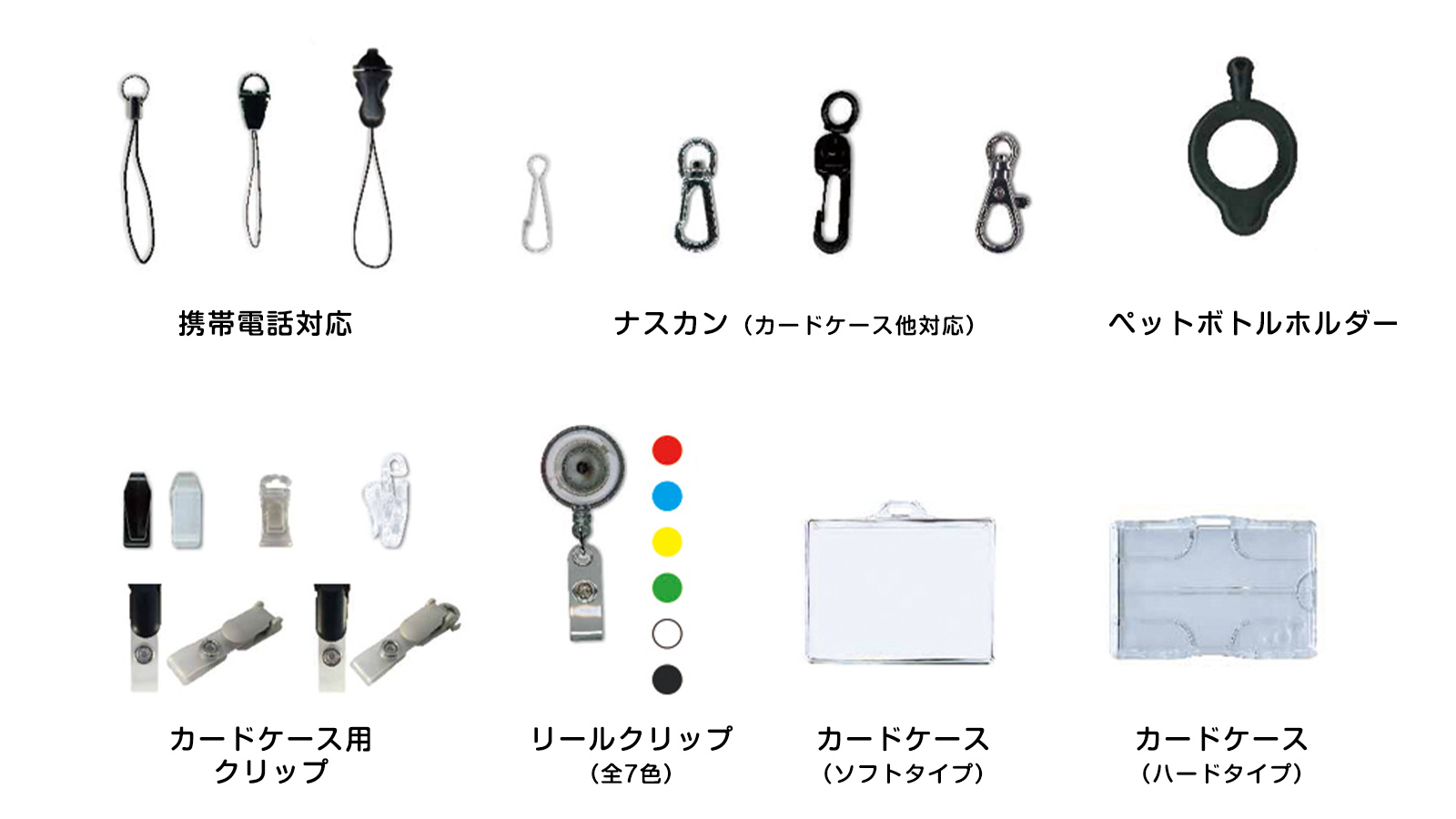 カードケースはイベントなどで活躍するソフトケース(塩ビ素材)と、社員証などの収納・保護に適したハードケース(硬質仕様)から選べます。その他にもリールクリップ、ドリンクホルダー、チケットフォルダー、ナスカン、マルカンなど、豊富なラインナップとなっています。