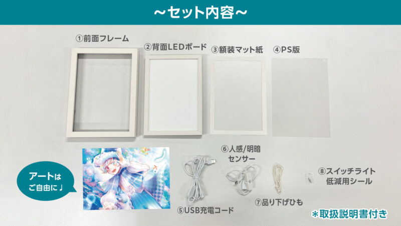 アートボードとしてすぐにご使用していただけるよう、額装フレームや配線コードなどセット内容もしっかり取り揃えております。